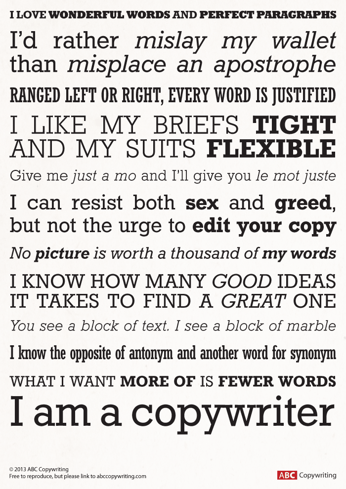 June 16, 2013June 16, 2013 I AM A COPYWRITER Repost of a great infographic from Tom Albrighton at ABC Copywriting. See the original here. share Share on X (Opens in new window) X Share on Facebook (Opens in new window) Facebook Email a link to a friend (Opens in new window) Email Share on Tumblr (Opens in new window) Tumblr Like Loading... Related