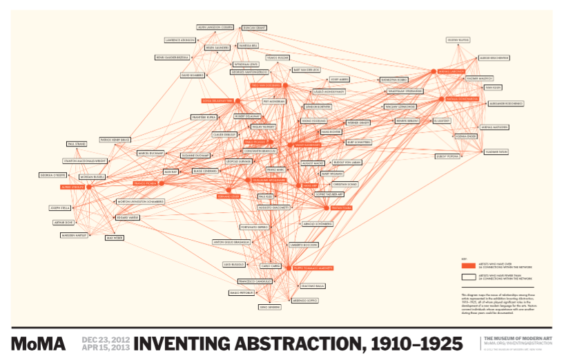 This exciting interactive visualization arrives from the Museum of Modern Art. It shows, explores and explains the networked flows of interactions and thought exchanges that lay beneath and within the Abstraction movement. As the site over declares: “Abstraction was not the inspiration of a solitary genius but the product of network thinking–of dieas moving through a nexus of artists and intellectuals working in different mediums and in far-flung places.”